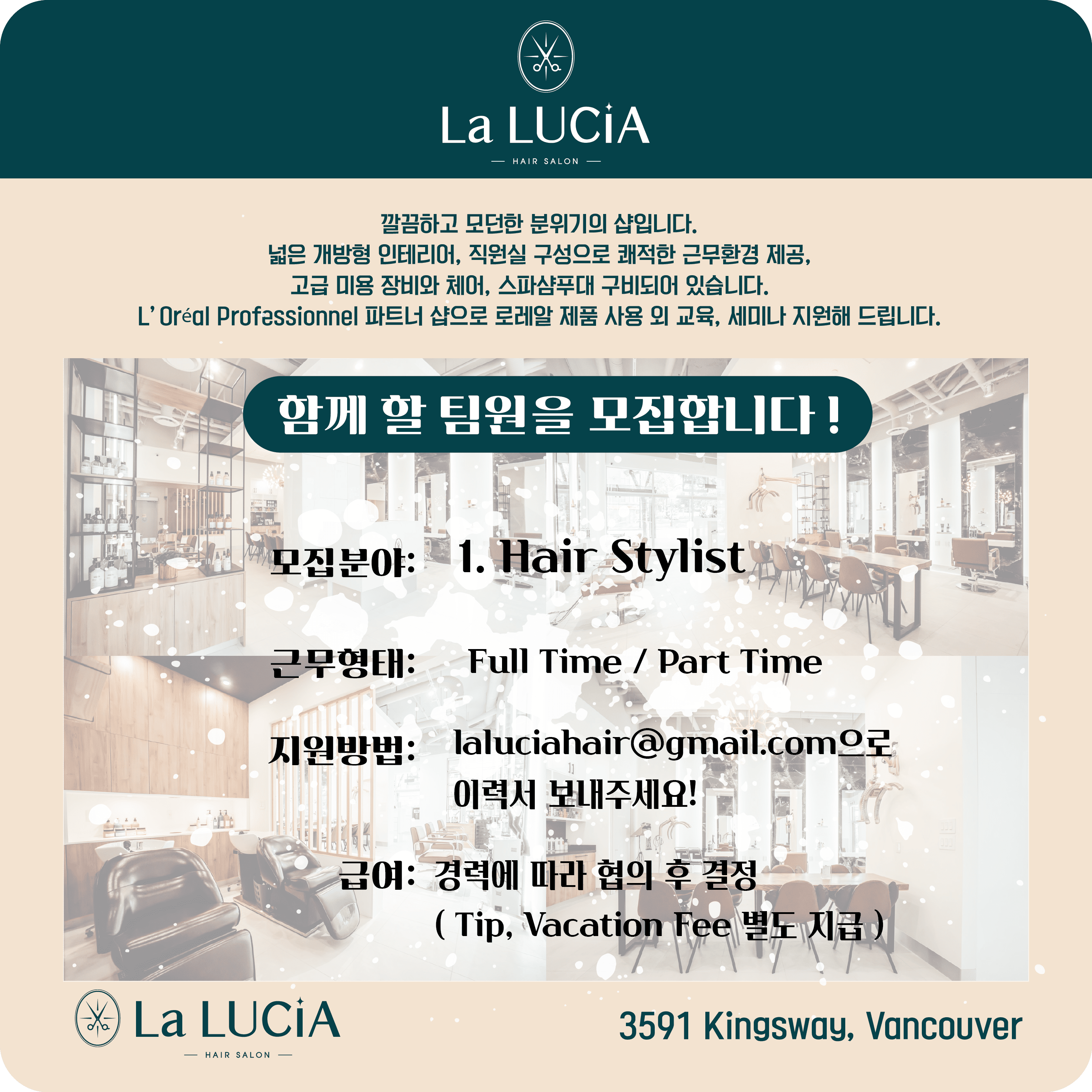 La LUCA Hair 에서 Hair Stylist 구인합니다. > 여기어때 밴쿠버